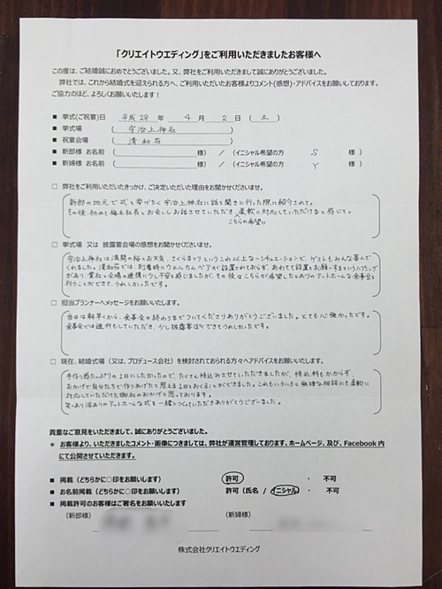 4月2日 宇治上神社にて挙式を挙げられましたお客様より、メッセージをいただきました。